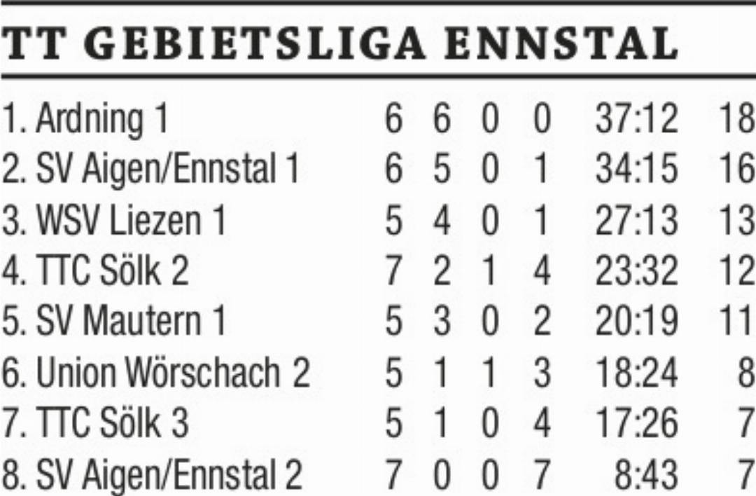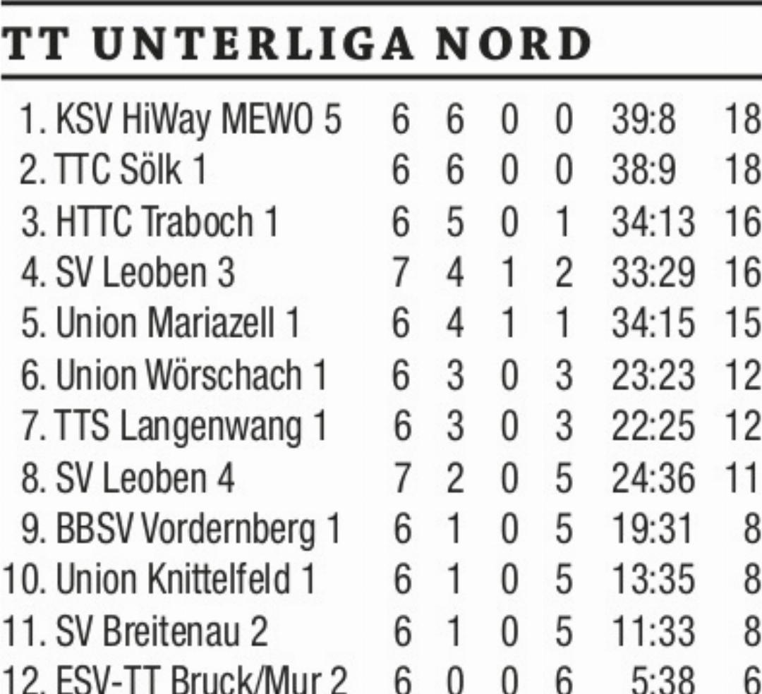Einen überlegenen Sieg und eine klare Niederlage verbuchten die zwei Bezirksmannnschaften in der vergangenen Runde der Unterliga Nord. TTC Sölk feierte mit dem 7:0-Auswärtssieg gegen Union Knittelfeld den sechsten Erfolg im ebensovielten Match. Gegen die mit nur zwei Akteuren angetreteten Murtaler hatten Daniel Moser, Stefan Mörschbacher und Markus Aichholzer leichtes Spiel. Am heutigen Freitag mit Beginn um 19 Uhr empfangen die zweitplatzierten Sölktaler im Spitzenspiel der 7. Runde Tabellenführer Kapfenberg 5.