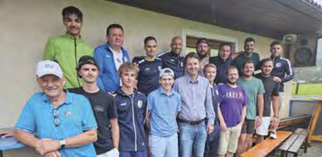 Auf Einladung der FPÖ besuchte der Triathlet Markus Mlinar den SV Stein an der Enns. An zwei Terminen wertete der Profisportler Laktattests der Fußballer aus, entwickelte Trainingseinheiten und gab wertvolle Ernährungstipps. Am Bild: Bezirksobmann und LAbg. Albert Royer (Mitte), Ortsparteiobmann und SV-Urgestein Ernst „Schoko“ Schachner (links) mit Markus Mlinar und den Kickern des SV Stein.