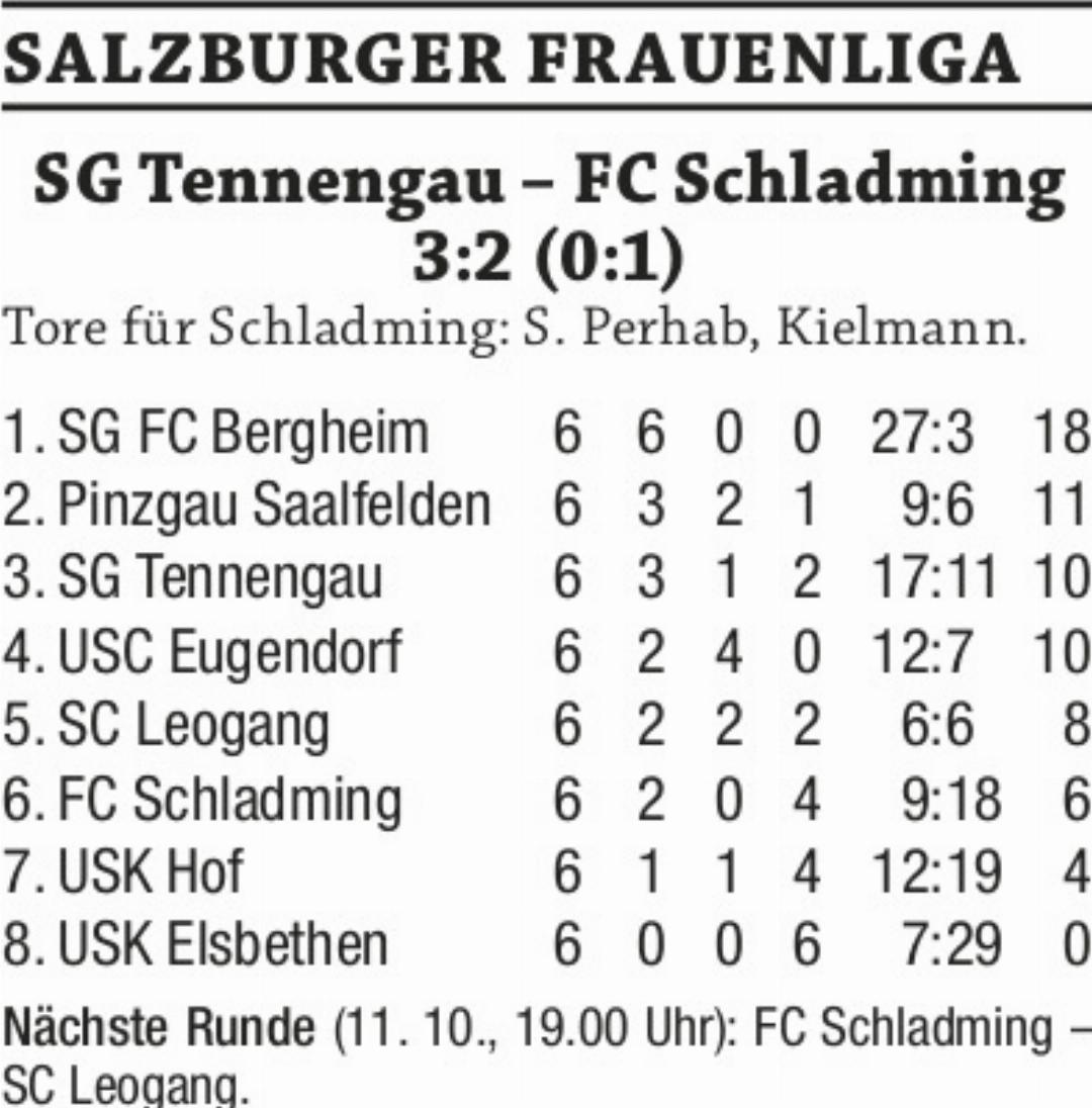 Auch im vierten Auswärtsspiel der Herbstsaison in der Salzburger Frauenliga gab es für die Damenelf des FC Schladming keinen Punktegewinn. Dabei schaute es für die WM-Städterinnen in dem Sechspunktespiel gegen die SG Tennengau lange Zeit gut aus. Das Gästeteam ging in der 19. Minute durch Sarah Perhab mit 0:1 in Führung und Maya Josephine Kielmann erhöhte sieben Minuten nach dem Seitenwechsel auf 0:2. Im weiteren Verlauf der zweiten Halbzeit ließ die Konzentration der Ennstalerinnen in der Defensive nach und die Hausherrinnen konnten so das Match noch drehen. Mit einem Doppelschlag glichen sie zum 2:2 aus und in der 82. Minute gelang Tennengau der Siegestreffer zum 3:2-Endstand. Am morgigen Samstag mit Beginn um 19 Uhr steht für die Schladminger Damenmannschaft das Heimspiel gegen SC Leogang auf dem Programm. Im Gegensatz zur auswärtigen Negativserie hat die Mannschaft von Trainerin Anna Miriam Wallner zu Hause bereits zwei Siege eingefahren. Mit dem dritten Erfolg in Serie könnten die Schladminger Kickerinnen den Tabellennachbarn überholen.