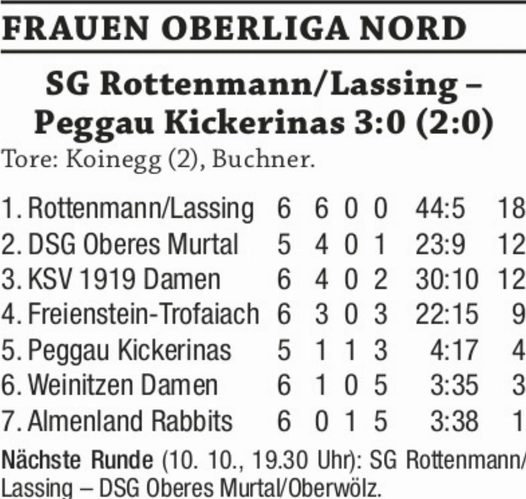 In der steirischen Frauenoberliga Nord wurde die SG Rottenmann/Lassing mit einem 3:0-Heimsieg gegen die SV Peggau Kickerinas ihrer Favoritenrolle gerecht. Die Hausherrinnen führten zur Pause durch einen Doppelschlag von Simone Buchner sowie Sofia Koinegg in der 24. und 25. Minute mit 2:0. Nach Wiederbeginn vergab die Limmer-Elf zahlreiche Chancen – unter anderem verschossen die Heimischen auch einen Elfmeter –, um den Sack frühzeitig zuzumachen. So mussten die SVR/SVL-Fußballgirls bis zur 93. Minute warten, ehe Sofia Koinegg mit ihrem zweiten Tor zum 3:0-Endstand die Partie endgültig zugunsten des Tabellenführers entschied. Sportchef Richard Pichlmaier sagte zum sechsten Sieg in Serie: „Spielerisch war es sicherlich nicht unsere beste Leistung, aber der Sieg stand nie in Gefahr.“ Am heutigen Freitag um 19.30 Uhr kommt es im Paltenstadion zum Spitzenspiel gegen den Tabellenzweiten DSG Oberes Murtal/Oberwölz. Mit dem siebenten Sieg in Serie könnte SG Rottenmann/Lassing bereits zwei Runden vor Saisonende den Herbstmeistertitel fixieren.