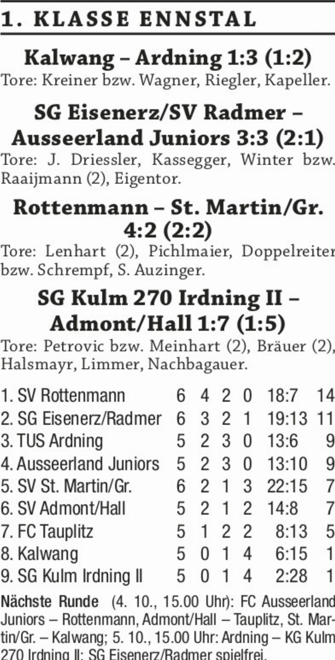 Drei Spiele der 7. Runde gehen morgen, Samstag, mit Beginn um 15 Uhr über die Bühne. Spitzenreiter SV Rottenmann muss beim Tabellenvierten Ausseerland Juniors antreten. SV Admont/Hall empfängt zu Hause den Tabellennachbarn FC Tauplitz. Nach einen schwachen Start sind die Heimischen seit drei Spielen ungeschlagen. Für den SV St. Martin steht das Heimspiel gegen Kalwang auf dem Programm. Gegen die noch punkteslosen Liesingtaler stehen die Chancen für die Hausherren auf den dritten Saisonsieg gut.