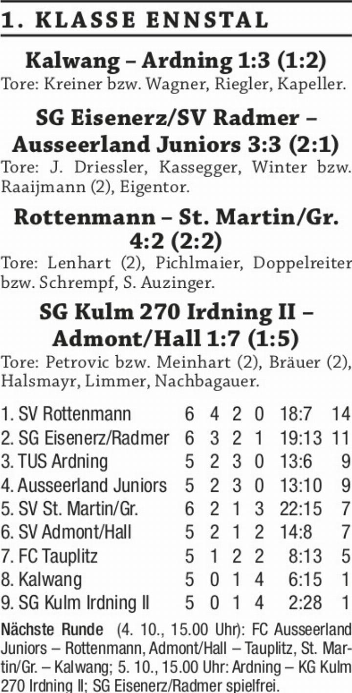 Dank einer starken zweiten Halbzeit feierte 1.-Klasse-Enns-Tabellenführer SV Rottenmann gegen SV St. Martin einen 4:2-Heimsieg. Die Gäste gingen vor der Pause durch Julian Schrempf sowie Simon Auzinger zweimal in Führung und den Hausherren gelang durch Christoph Pichlmaier sowie Armin Doppelreiter ebenso oft der Ausgleich. Nach dem Seitenwechsel übernahmen die Paltentaler zusehends das Kommando. Marc Eduard Lenhart brachte den Leader in der 66. Minute mit 3:2 in Führung und vier Minuten vor dem Schlusspfiff sorgte derselbe Kicker mit seinem zweiten Tor zum 4:2-Endstand für die endgültige Entscheidung zugunsten der Elf von Trainer Patrick Löcker. Mit dem vierten Saisonsieg baute der SVR den Vorsprung zu Verfolger SG WSV Eisenerz/SV Radmer auf drei Punkte aus.