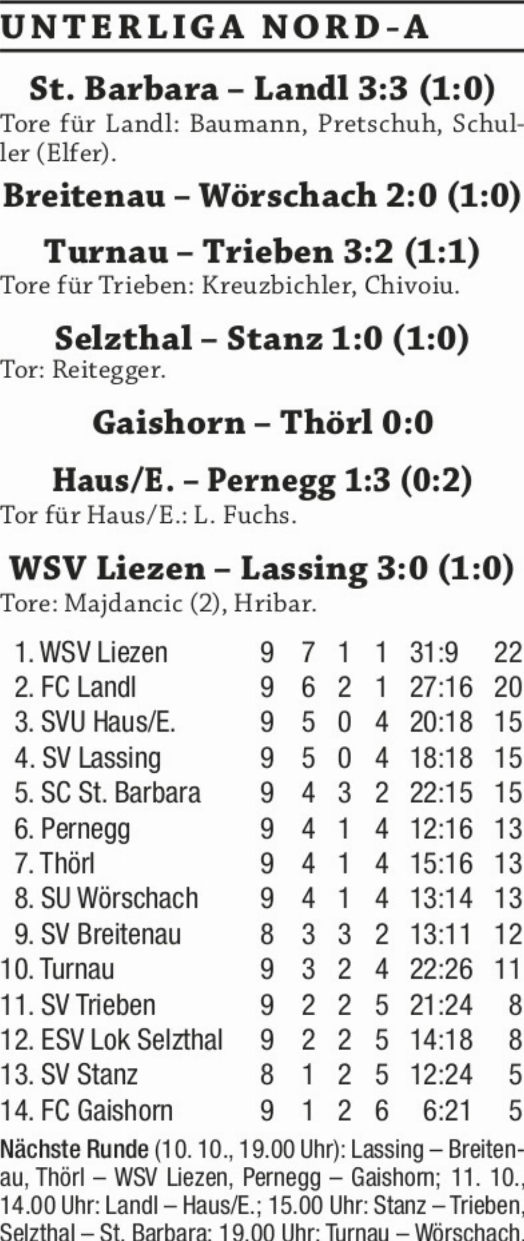 Nach dem glanzvollen Derbysieg gegen Leader WSV Liezen wurde SU Wörschach mit der 0:2-Auswärtsniederlage gegen Breitenau wieder auf den Boden der Realität zurückgeholt. Der letztendlich entscheidende zweite Treffer fiel erst in der Nachspielzeit. SV Trieben ging im Auswärtsspiel gegen Aufsteiger Turnau in der 22. Minute durch Jan Kreuzbichler mit 0:1 in Führung. Zehn Minuten später glichen die Hausherren zum 1:1 aus und zu allem Überdruss sah Benjamin Zeiselberger bei dieser Aktion wegen Kritik die gelb/rote Ampelkarte. Ohne den Spielmacher gerieten die Magnesitstädter in der zweiten Halbzeit mit 1:3 in Rückstand. Vasilie Tiberiu Chivoiu gelang in der 85. Minute das Anschlusstor zum 3:2, doch die anschließende Schlussoffensive der Paltentaler blieb am Ende unbelohnt. ESV Lok Selzthal sammelte mit dem 1:0-Heimsieg gegen SV Stanz wertvolle Punkte im Abstiegskampf. Das Goldtor beim zweiten Saisonerfolg erzielte Niklas Reitegger bereits in der 10. Minute. Nach dem vorwöchigen ersten Sieg seit 14 Spielen blieb FC Gaishorn mit dem torlosen Heimremis gegen SV Thörl im zweiten Spiel in Serie ungeschlagen.