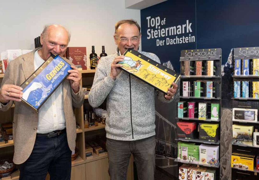 Die Planai-Hochwurzen-Bahnen gehen neue Wege und präsentierten am Dachstein-Gletscher gemeinsam mit dem steirischen Chocolatier Josef Zotter eigens kreierte Schokoladenprodukte. Ab sofort sind die exklusiven Kreationen in den Shops am Dachstein, der Planai und am Wilden Berg in Mautern erhältlich. Ein besonderes Augenmerk lag auf den eigens gestalteten Banderolen und Schokoladennamen. Dazu zählen unter anderem die Kreationen „Bridgewalker“, „Stairway to Cheesecake“, „Genuss auf höchstem Niveau“, „Chocky Mountain“, „Top of Steiermark“ uvm.
